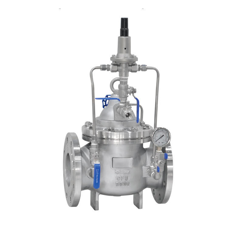 作持壓閥時,主閥安裝于主管路上,即與主管道串聯安裝。只要主閥上游的供水壓力低于導閥17設定值時,主閥就處于關閉狀態,當主閥上游的供水壓力超過導閥17設定值時,主閥才會打開,向主閥下游供水,從而保證了主閥上游的供水壓力。主要用于維護城市干管最低供水壓力,特別是發生火災時,可防止支管用戶過度抽水降壓。