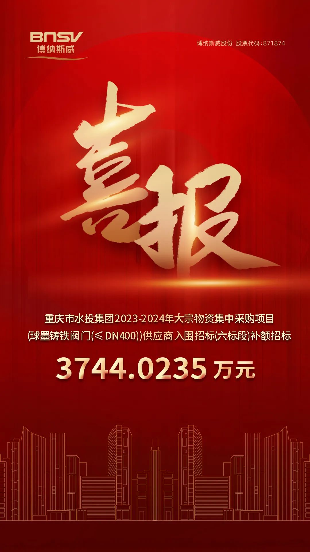 喜報!博納斯威入圍中標重慶市水投集團2023-2024年大宗物資集中采購項目(六標段)3744.0235萬元