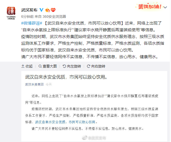 武漢水務辟謠:武漢自來水安全優質,市民可以放心飲用