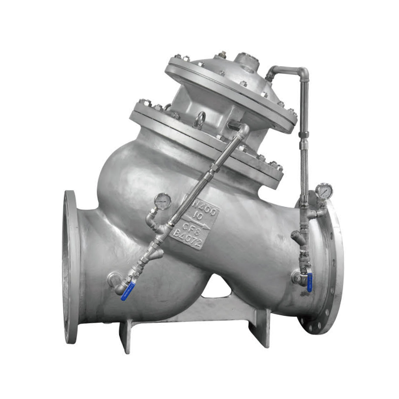 3、消除水錘和噪音:水泵停止運行時,主閥分兩級關閉,主閥瓣先快速關90%,小閥瓣再緩慢關閉(關閉速度可根據現場工況進行調節),從而消除了水錘和噪音。